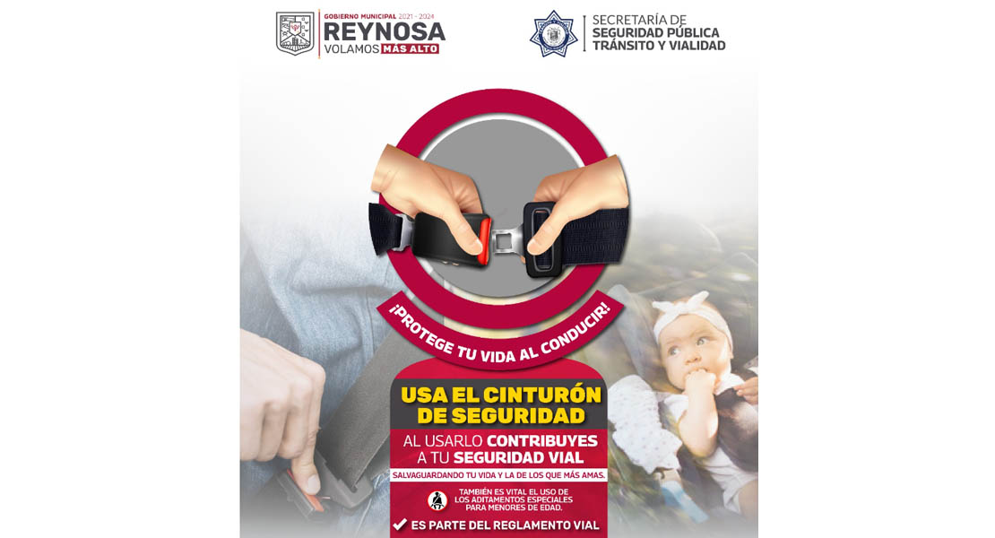 Reynosa, Tam.- Ante la importancia del uso del cinturón de seguridad, para evitar lesiones por accidentes automovilísticos y eventualmente lamentables resultados, el Gobierno de Reynosa a través de la Secretaría de Seguridad Pública, Tránsito y Vialidad, exhorta a concientizarse en el uso del mismo y salvaguardar la integridad propia y de sus pasajeros.