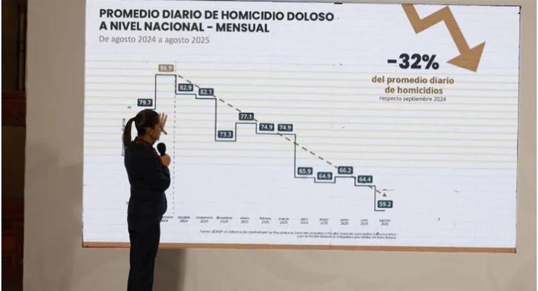 Ciudad de México.- El Gobierno de México dio a conocer este 9 de septiembre que los homicidios dolosos registraron una reducción del 32% en agosto de 2025 respecto al mismo mes del año pasado y en lo que va del sexenio. Según las cifras reveladas por el Gabinete de Seguridad durante «La Mañanera del pueblo» de la Presidenta Claudia Sheinbaum este martes, al pasar de un promedio diario de 86.9 víctimas a 59.2. Este descenso equivale a 27 homicidios menos en comparación con septiembre de 2024, y que convierte al de 2025 en el mes de agosto con menor incidencia en este delito desde 2015.