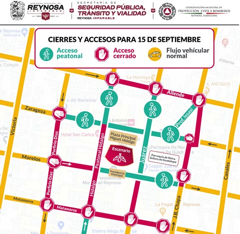 Lo accesos peatonales serán únicamente por Zaragoza con Miguel Hidalgo; Zaragoza con Juárez; Profr. Isassi con Zaragoza y Juárez, y Morelos con Juárez. Se recomienda a los automovilistas planificar su ruta en caso de acudir a la Zona Centro durante el día de la celebración.