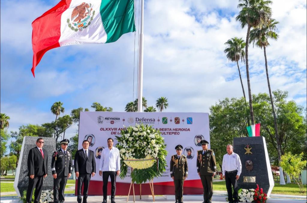 Reynosa, Tam.- El Presidente Municipal de Reynosa, Carlos Peña Ortiz, participó junto al Comandante de la Octava Zona Militar, General de Brigada DEM Guillermo Arellano Morales, en la Ceremonia del CLXXVIII Aniversario de la Batalla del Castillo de Chapultepec, llevada a cabo este sábado 13 de septiembre.