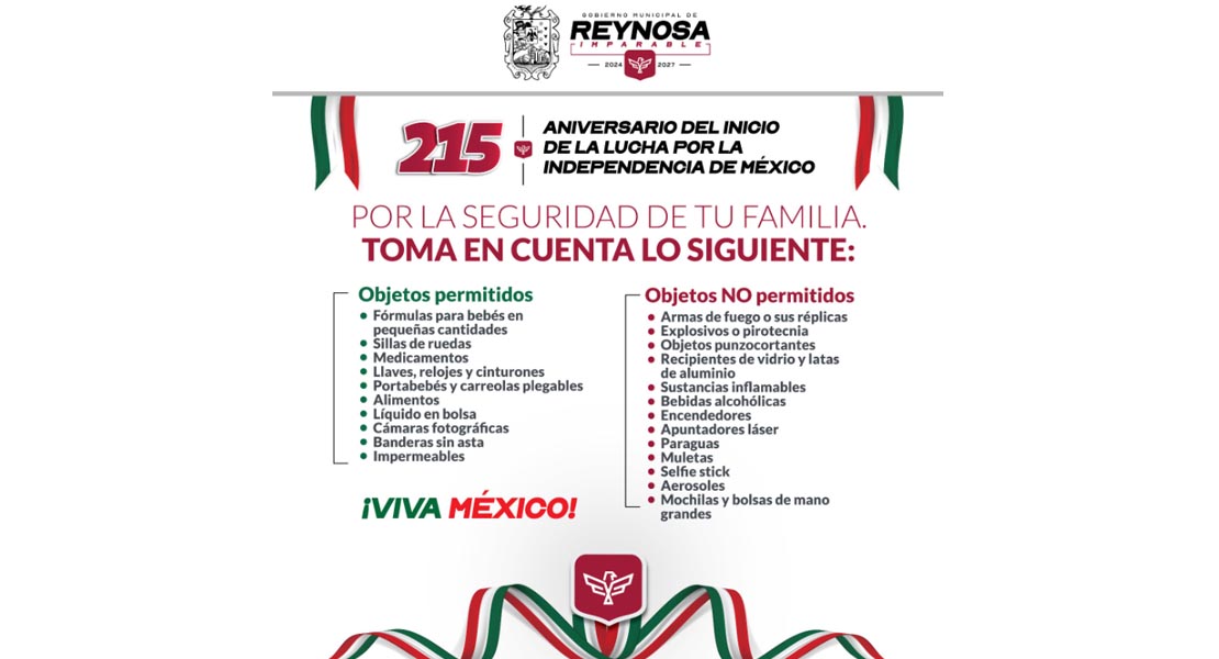 Reynosa, Tam.- La Coordinación de Protección Civil del Gobierno de Reynosa da a conocer la lista de artículos que podrás ingresar durante la celebración del 215 Aniversario del Inicio de la Lucha por la Independencia de México en la plaza Miguel Hidalgo; evita llevar artículos NO permitidos.