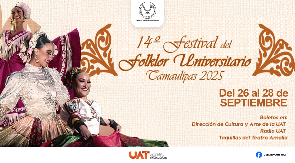 Ciudad Victoria, Tam.- En el marco de su compromiso con la difusión de la cultura y las artes, y la vinculación con la sociedad, la Universidad Autónoma de Tamaulipas (UAT) organiza el 14.º Festival del Folklor Universitario Tamaulipas 2025, el cual se llevará a cabo del 26 al 28 de septiembre, en Ciudad Victoria.