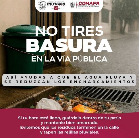 Reynosa, Tam.- La Comisión Municipal de Agua Potable y Alcantarillado de Reynosa hace un llamado a la ciudadanía a evitar arrojar basura en calles y banquetas, con el objetivo de permitir que el agua fluya correctamente por las rejillas pluviales y así reducir los encharcamientos e inundaciones en la ciudad en esta temporada de lluvias.
