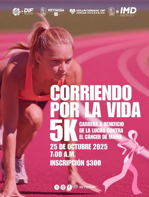 Reynosa, Tam.- El Sistema DIF Reynosa, en conjunto con el Voluntariado DIF, el Gobierno Municipal y el Instituto Municipal del Deporte, invita a la ciudadanía a sumarse a la carrera 5K “Corriendo por la Vida”, que se llevará a cabo el próximo 25 de octubre a las 7:00 de la mañana en las instalaciones del Museo del Ferrocarril, ubicado en Ferrocarril s/n, en la zona centro, Reynosa.