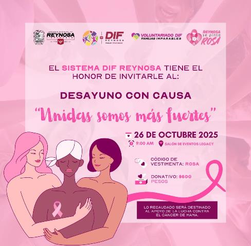 Reynosa, Tam.- El Sistema DIF-Reynosa que preside Carlos Luis Peña Garza y el Voluntariado DIF que encabeza Alejandra Yelitza Garza, invita a la sociedad civil, empresas, agrupaciones y ciudadanía a participar en el Desayuno con Causa “Unidas Somos Más Fuertes”, un evento diseñado para apoyar la lucha contra el cáncer de mama y brindar esperanza a mujeres valientes que enfrentan esta enfermedad.