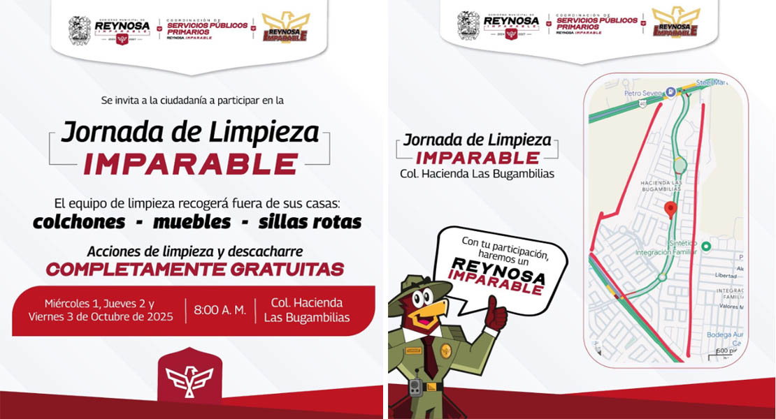 Reynosa, Tam.- El Presidente Carlos Peña Ortiz programó para las familias de la colonia Hacienda Las Bugambilias la Jornada de Limpieza Imparable durante los días miércoles 1, jueves 2 y viernes 3 de octubre, un servicio gratuito que incluye la recolección de sillas, colchones, muebles inservibles en general.