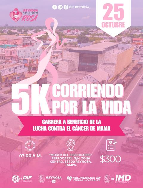 Reynosa, Tam.- Participa en la «5K Corriendo por la Vida», y sé parte de la Lucha Contra el Cáncer de Mama; el Alcalde Carlos Peña Ortiz y la Presidenta del Voluntariado DIF-Reynosa, Alejandra Yelitza Garza, te invitan a esta competencia con causa el día 25 de octubre.