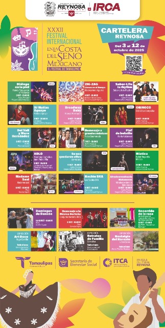 Reynosa, Tam.- El Presidente Municipal, Carlos Peña Ortiz, invita a la comunidad reynosense a disfrutar del XXXII Festival Internacional en la Costa del Seno Mexicano, del 3 al 12 de octubre con más de 20 eventos de alta calidad artística, gratis para todos.