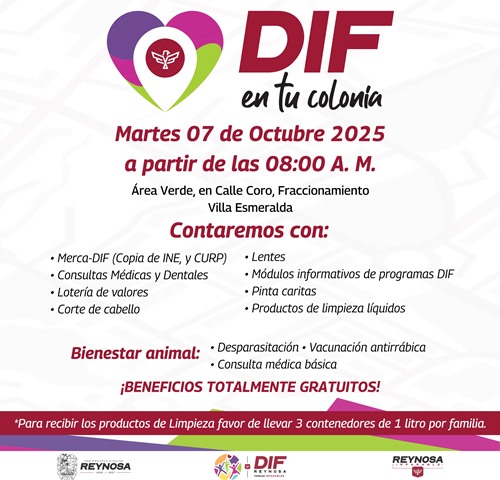 Reynosa, Tam.- Por instrucciones del Alcalde, Carlos Peña Ortiz, el Sistema DIF-Reynosa que preside Carlos Luis Peña Garza, llevará una nueva brigada del programa “DIF en Tu Colonia” al fraccionamiento Villa Esmeralda, este martes 7 de octubre, a partir de las 8:00 de la mañana, en el área verde ubicada sobre la calle Coro.