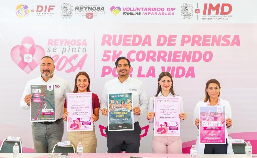 El Presidente Municipal Carlos Peña Ortiz y la Presidenta de Damas Voluntarias del DIF-Reynosa, dieron a conocer detalles de la Carrera 5K como parte de la Campaña de Prevención del Cáncer de Mama 2025, además del «Desayuno con Causa».
