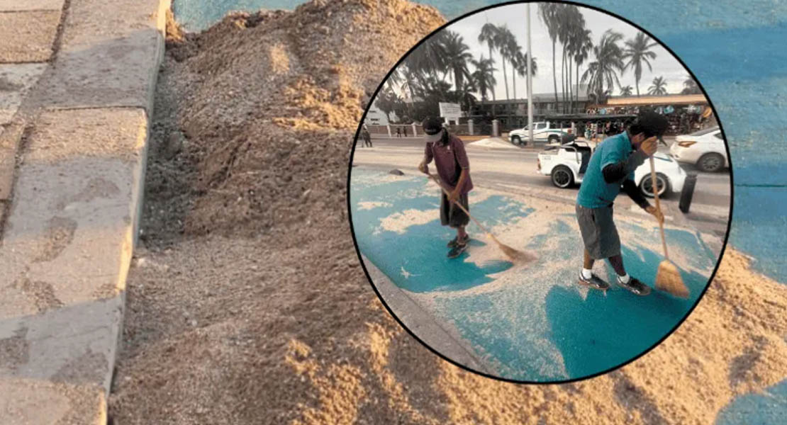 El fenómeno natural que el lunes pasado obligó a la capitanía del puerto a restringir la navegación de embarcaciones menores y al ayuntamiento cerrar los accesos de bañistas a las playas como medida de protección por el inmenso oleaje que se presentó, arrojó grandes cantidades de área a las banquetas y área peatonal del malecón.