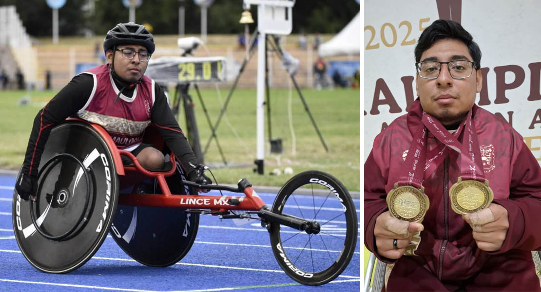 El talentoso deportista logró subir a lo más alto del podio en las pruebas de 800 metros planos T34 y 100 metros planos T34, demostrando su disciplina, esfuerzo y gran nivel competitivo.