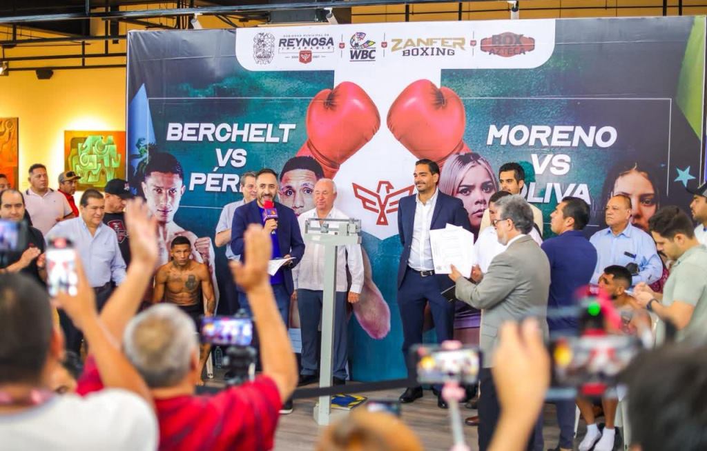 Reynosa, Tam.- El Alcalde Carlos Peña Ortiz y el Presidente del Consejo Mundial de Boxeo, Mauricio Sulaimán, encabezaron la Ceremonia de Pesaje de los peleadores por el «Cinturón Reynosa» del WBC, Miguel «El Alacrán» Berchelt y Edixon «El Cabezón» Pérez, un duro y decisivo encuentro que se llevará a cabo este sábado 11 de octubre en el Gimnasio de la UAT.