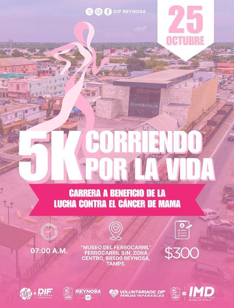 Reynosa, Tam.- El Sistema DIF-Reynosa que encabeza Carlos Luis Peña Garza, invita a agrupaciones, corredores y a toda la ciudadanía a participar en la Carrera 5K “Corriendo por la Vida”, una actividad que combina deporte, solidaridad y conciencia social, en el marco de la lucha contra el cáncer de mama.