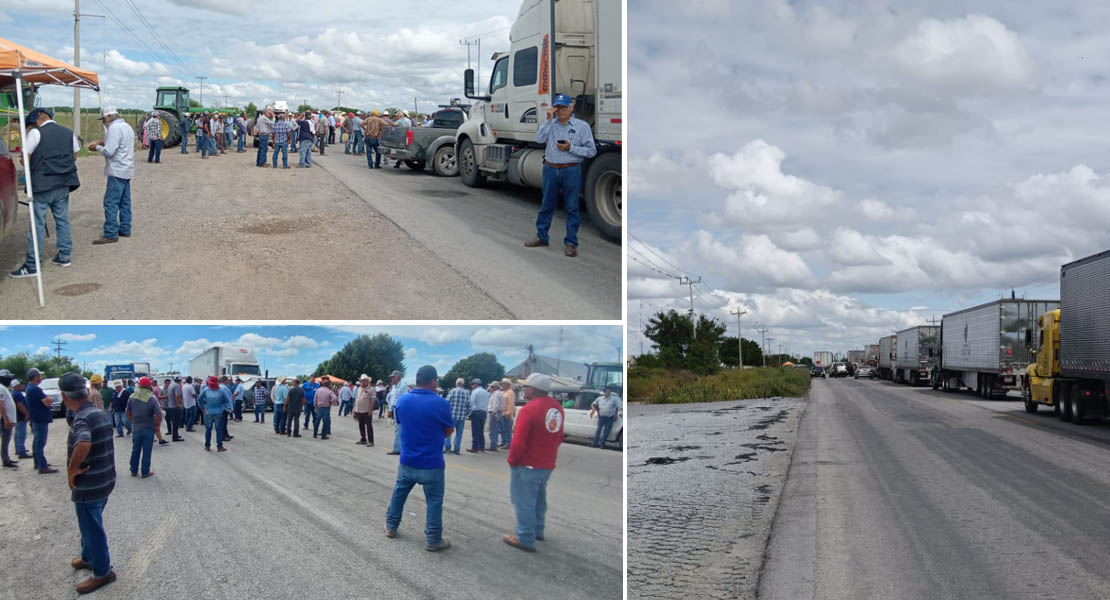 San Fernando, Tamaulipas.- Alrededor de 60 productores agrícolas y 20 vehículos mantienen cerrada en ambos sentidos la Carretera Federal 101 Victoria-Matamoros sobre el kilómetro 201 a la altura del municipio de San Fernando.