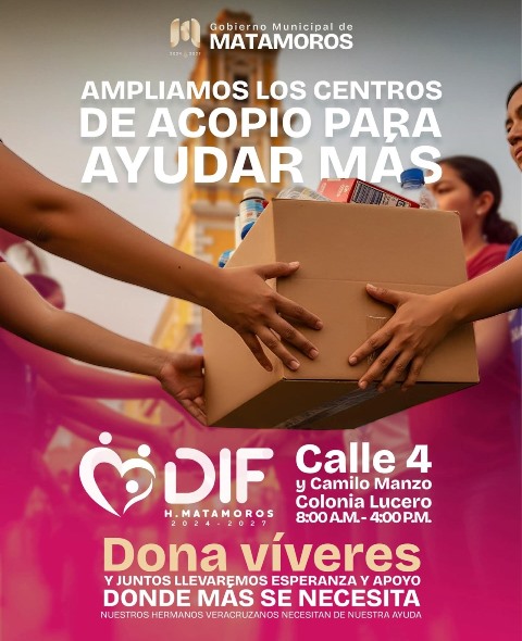 Esta acción se realiza en coordinación con el Gobierno Municipal de Matamoros, con el objetivo de brindar apoyo y esperanza, por ello se ha habilitado un centro de acopio en las instalaciones de DIF Central, ubicadas en la esquina de Calle 4 y Camilo Manzo. En este espacio, la comunidad matamorense podrá donar alimentos no perecederos, artículos de higiene personal, productos de limpieza, ropa en buen estado y otros artículos de primera necesidad.