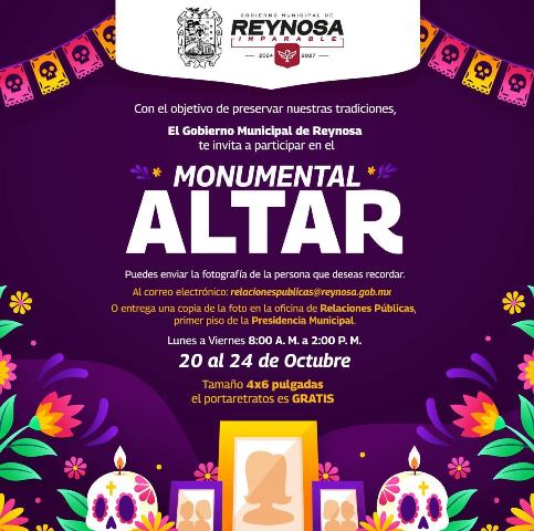 Reynosa, Tam.- El Presidente Municipal Carlos Peña Ortiz invita a la comunidad a ser parte de la preservación de las tradiciones nacionales, en el Monumental Altar, de la plaza principal Miguel Hidalgo de Reynosa, con el que se celebra a quienes ya no están físicamente con nosotros.