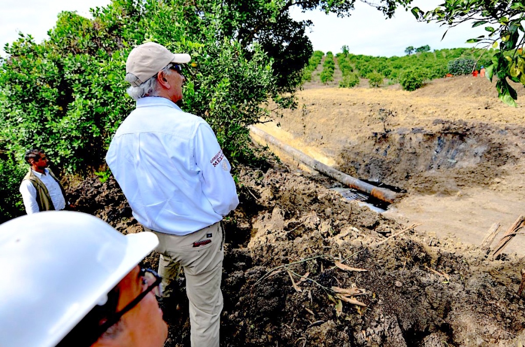 Pantepec, Veracruz.- El director general de Petróleos Mexicanos, Dr. Víctor Rodríguez Padilla, supervisó los trabajos que se realizan para contener y recuperar el hidrocarburo en el arroyo Citlaltépetl, en su unión con el río Pantepec-Tuxpan y recorrió la zona afectada por una fuga en el oleoducto Poza Rica-Madero, misma que ya fue sellada y que ya está en operación.