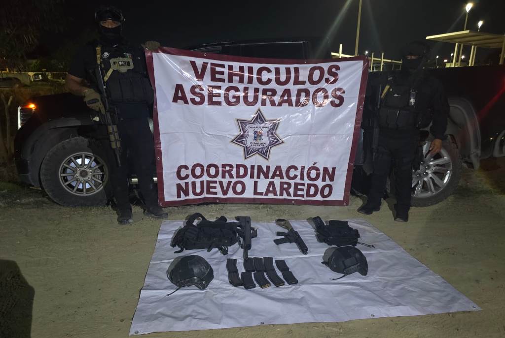 Nuevo Laredo, Tamaulipas.- Personal de la Guardia Estatal aseguró un vehículo, armamento y equipo táctico luego de repeler una agresión de civiles armados durante un recorrido de vigilancia en la colonia Infonavit Benito Juárez, en Nuevo Laredo.