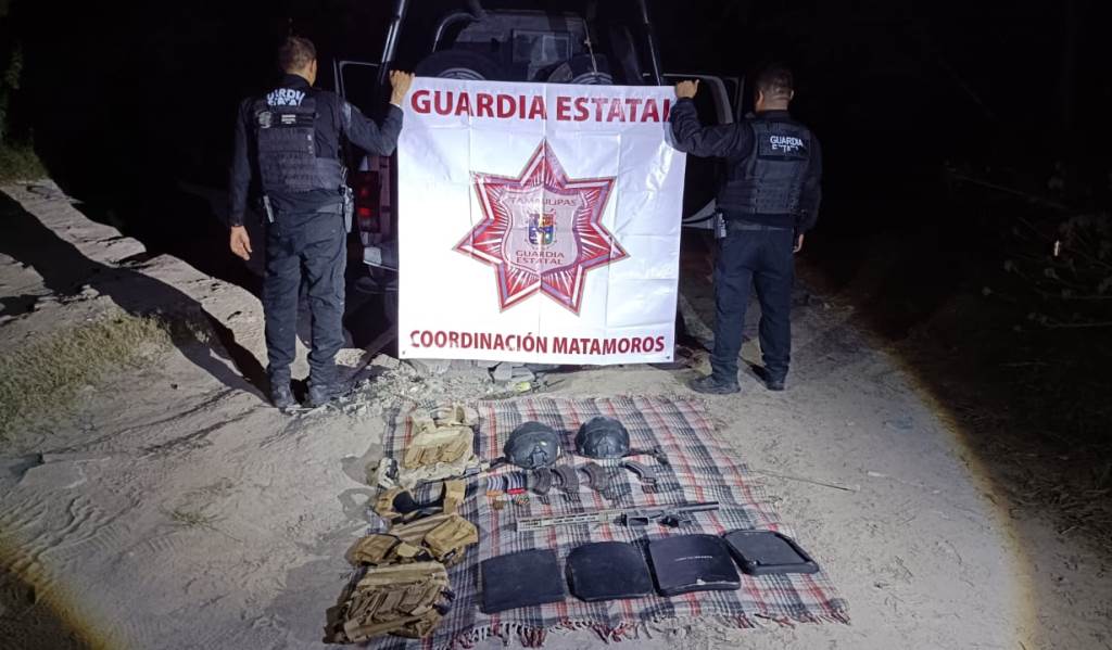 Matamoros, Tamaulipas.- Elementos de la Guardia Estatal aseguraron un arma larga, cargadores y equipo táctico en un predio del ejido Barranquitas.