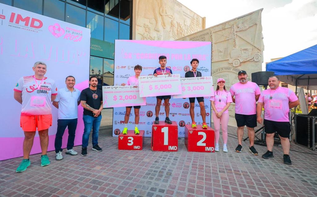 Reynosa, Tam.- En un ambiente lleno de solidaridad y esperanza, más de 500 participantes se unieron este sábado a la Carrera 5K “Corriendo por la Vida”, organizada por el Sistema DIF-Reynosa, que preside Carlos Luis Peña Garza, y el Voluntariado DIF encabezado por Alejandra Yelitza Garza, en coordinación con el Instituto Municipal del Deporte, en el marco del mes Rosa.