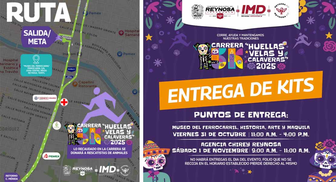 Reynosa, Tam.- En vista del gran interés de los atletas reynosenses, el Presidente Municipal Carlos Peña Ortiz sigue invitando a la comunidad a participar en la Carrera Huellas, Velas y Calaveras, a celebrarse este 2 de noviembre a las 7:00 A. M. saliendo del Museo del Ferrocarril, Historia, Arte y Maquila, que será también la meta recorriendo el bulevar Morelos hasta el Retorno en la calle Mérida.