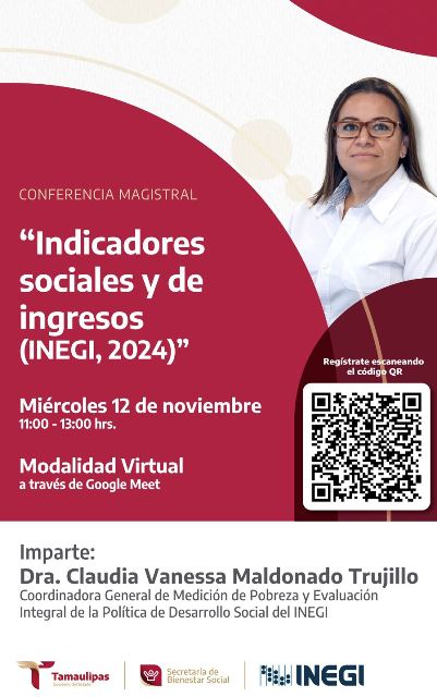 Ciudad Victoria, Tamps.- La videoconferencia magistral “Indicadores Sociales y de Ingresos (INEGI, 2024)”, será dictada por la Dra. Claudia Vanessa Maldonado Trujillo, coordinadora general de Medición de Pobreza y Evaluación Integral de la Política de Desarrollo Social del INEGI, el próximo miércoles 12 de noviembre, informó la secretaria de Bienestar Social Silvia Casas González.