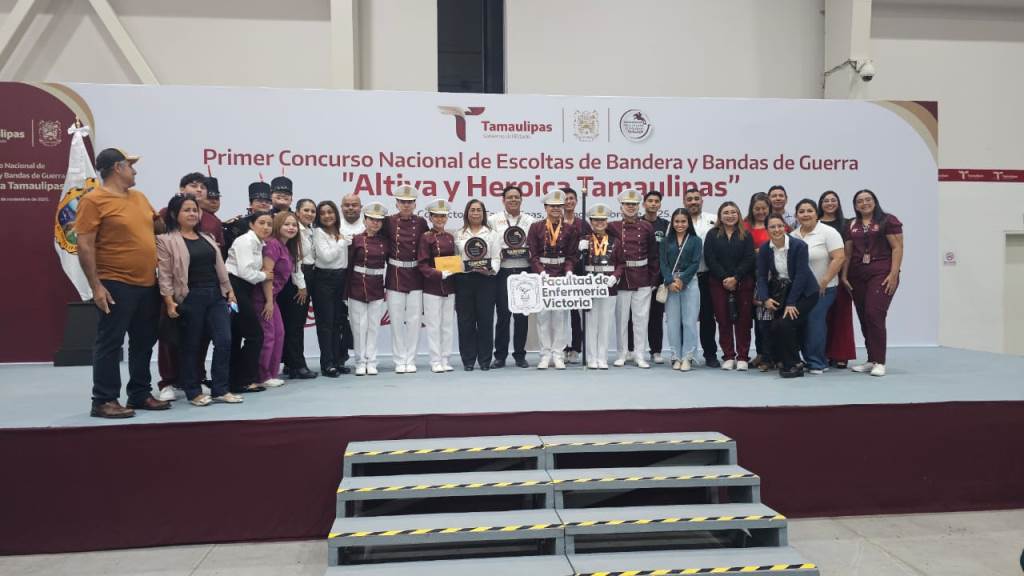 Ciudad Victoria, Tam.- Con gran orgullo institucional, la Facultad de Enfermería Victoria de la Universidad Autónoma de Tamaulipas (UAT) obtuvo el primer lugar en las categorías Nivel Superior y Libre del Primer Concurso Nacional de Bandas de Guerra y Escoltas de Bandera “Altiva y Heroica Tamaulipas”, organizado por el Gobierno del Estado y celebrado este 8 de noviembre en el Polyforum de Ciudad Victoria.