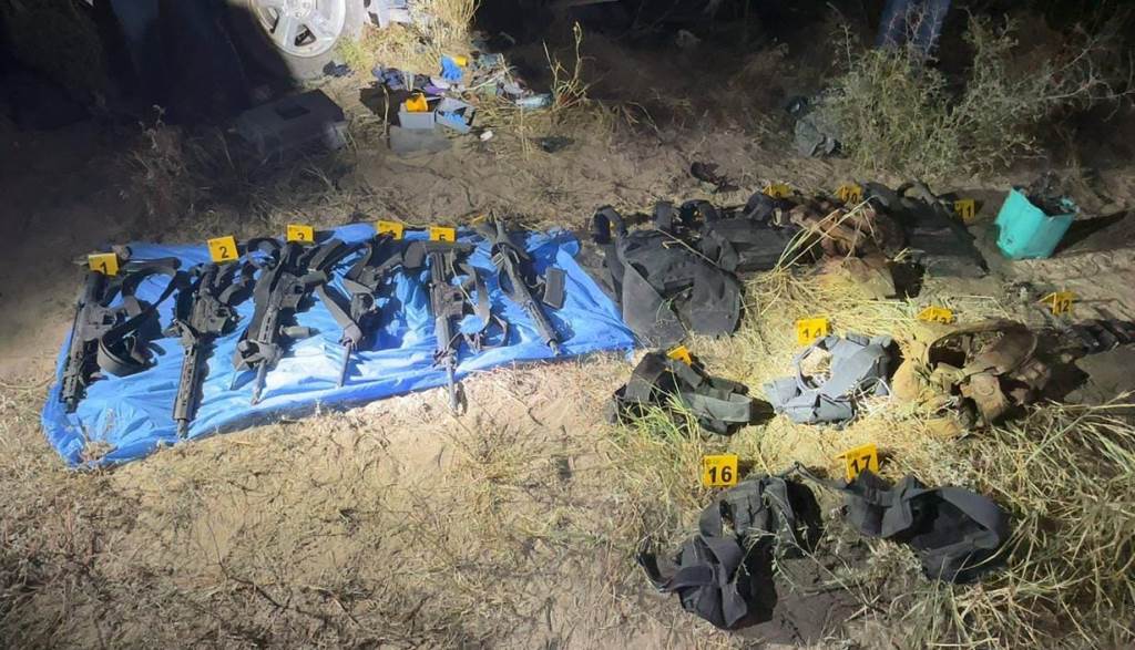 Reynosa, Tamaulipas.- Personal de la Guardia Estatal repelió una agresión armada en la brecha TAM–Santo Domingo en Reynosa, en donde fueron aseguradas seis armas largas, equipo táctico, ponchallantas, un vehículo con reporte de robo en el extranjero, y cinco personas reducidas.