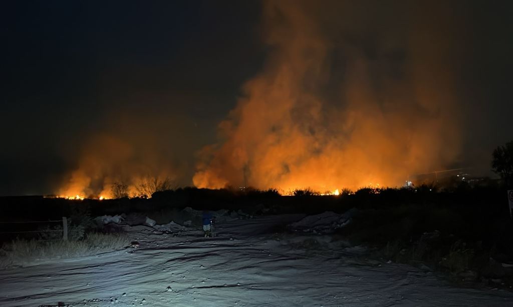Reynosa, Tam.- La Coordinación de Protección Civil y Bomberos del Gobierno de Reynosa acudió a la colonia La Cima, donde al recibir un reporte la noche de este domingo 9 de noviembre, combatió un incendio en cerca de tres hectáreas de pastizal y basura que amenazaba el área habitacional.