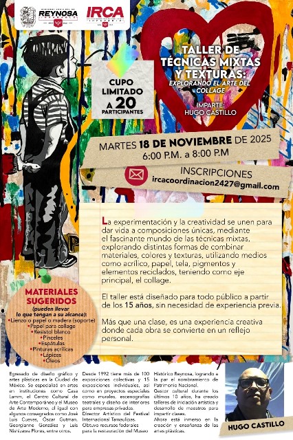 Reynosa, Tam.- Por instrucciones del Alcalde Carlos Peña Ortiz, el Instituto Reynosense para la Cultura y las Artes convoca al Taller de Técnicas Mixtas y Texturas “Explorando el Arte del Collage”, impartido por el artista Hugo Castillo.