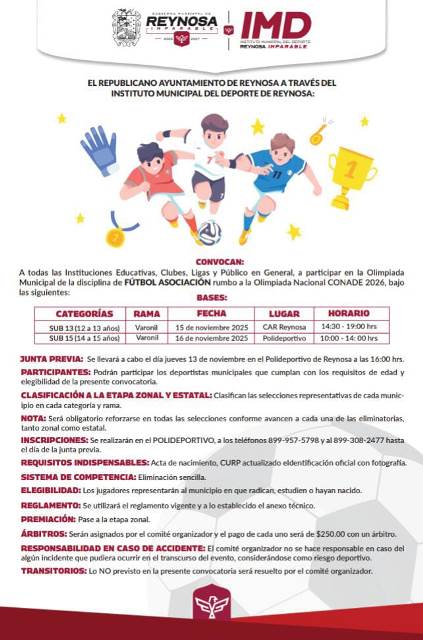 Reynosa, Tam.- El Alcalde Carlos Peña Ortiz hace la invitación a todas las instituciones educativas, clubes, ligas y al público en general a participar en la disciplina de Fútbol Asociación, que se llevará a cabo dentro de la Olimpiada Municipal rumbo a la Olimpiada Nacional CONADE 2026 a través del Instituto Municipal del Deporte.