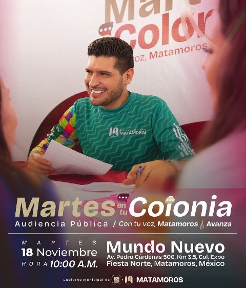 H. Matamoros, Tamaulipas.- El alcalde Beto Granados encabezará este martes 18 de noviembre una nueva jornada del programa «martes en tu colonia’, que se llevará a cabo en las instalaciones del Centro de Convenciones Mundo Nuevo a partir de las 10:00 de la mañana, con el propósito de acercar los principales servicios municipales a las familias matamorenses.