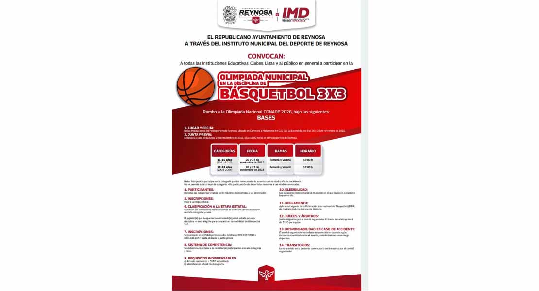 Reynosa, Tam.- El Alcalde Carlos Peña Ortiz invita a todas las instituciones educativas, clubes, ligas y al público en general a participar en la Olimpiada Municipal en la disciplina de Basquetbol 3×3, rumbo a la Olimpiada Nacional CONADE 2026, con el objetivo de impulsar el talento deportivo local.