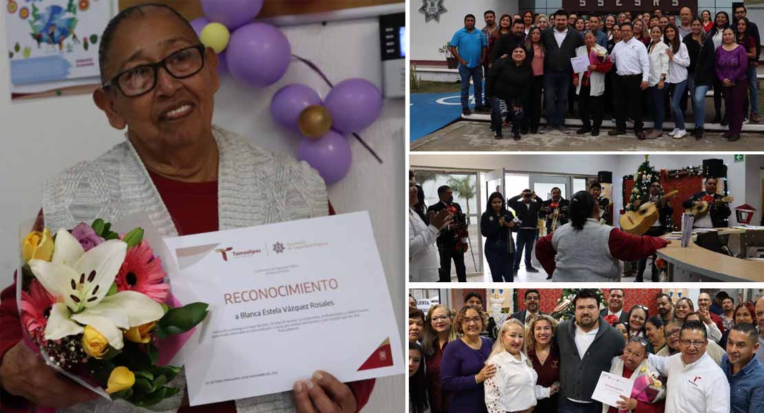 Ciudad Victoria, Tamaulipas.- Con una serenata con mariachi y abrazos de sus compañeros y compañeras, Blanca Estela Vázquez Rosales se despidió de la Secretaría de Seguridad Pública de Tamaulipas (SSPT) tras 35 años de servicio dentro de la Subsecretaría de Ejecución de Sanciones y Reinserción Social.