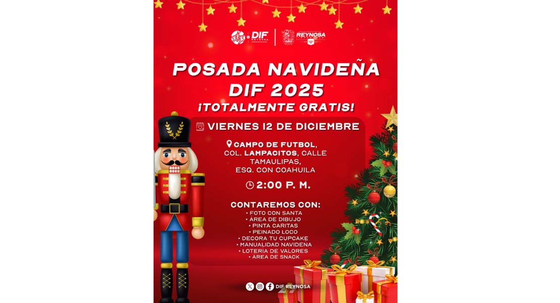 Reynosa, Tam.- El Sistema DIF-Reynosa que preside Carlos Luis Peña Garza, invita a la Posada Navideña DIF 2025, en la colonia Lampacitos, una celebración que reunirá a familias de este sector y de zonas aledañas, el evento se llevará a cabo en el campo de futbol ubicado en la calle Tamaulipas, esquina con Coahuila, a partir de las 2:00 de la tarde este viernes 12 de diciembre.