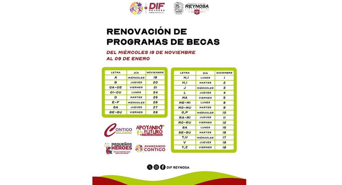 Se invita a las familias que forman parte de las becas: Contigo Soy Capaz, Apoyando Tu Futuro, Pequeños Héroes y Avanzando Contigo, a que acudan a renovar su trámite en las instalaciones del DIF central ubicadas en el bulevar Hidalgo número 1900, colonia Hidalgo, donde el personal brinda orientación y apoyo para asegurar el acceso oportuno a estos estímulos económicos.