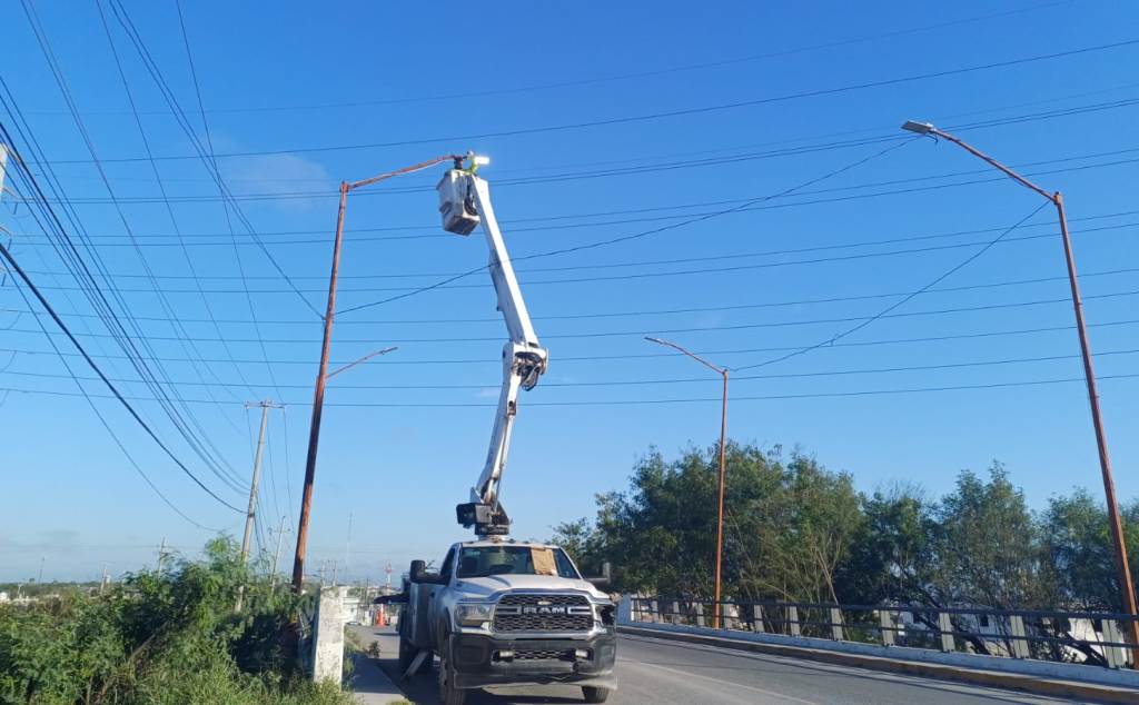 Los trabajadores, con apoyo de canastillas, sustituyeron lámparas Led que no funcionaban y reconectaron otras en buen estado para lograr la iluminación de toda la calle que es paso importante para varias colonias.