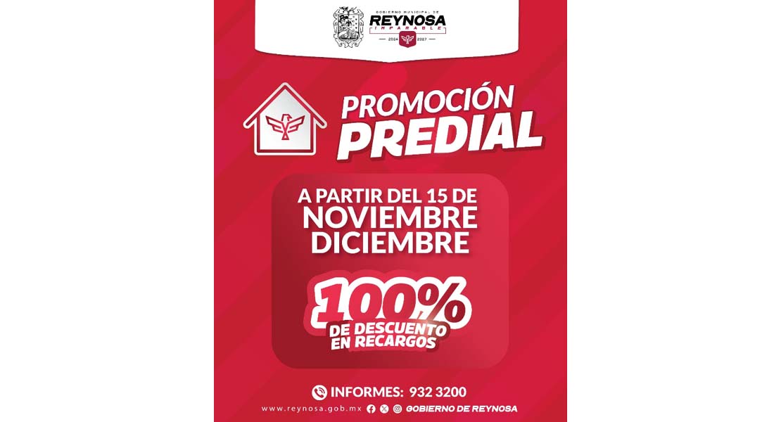✅ El Gobierno Municipal de #Reynosa, que preside el Alcalde Carlos Peña Ortiz, ofrece 100% de descuento en recargos del Impuesto Predial hasta el 31 de diciembre. Adultos mayores, jubilados, pensionados y personas con discapacidad obtienen 50% de descuento en el ejercicio fiscal 2025.