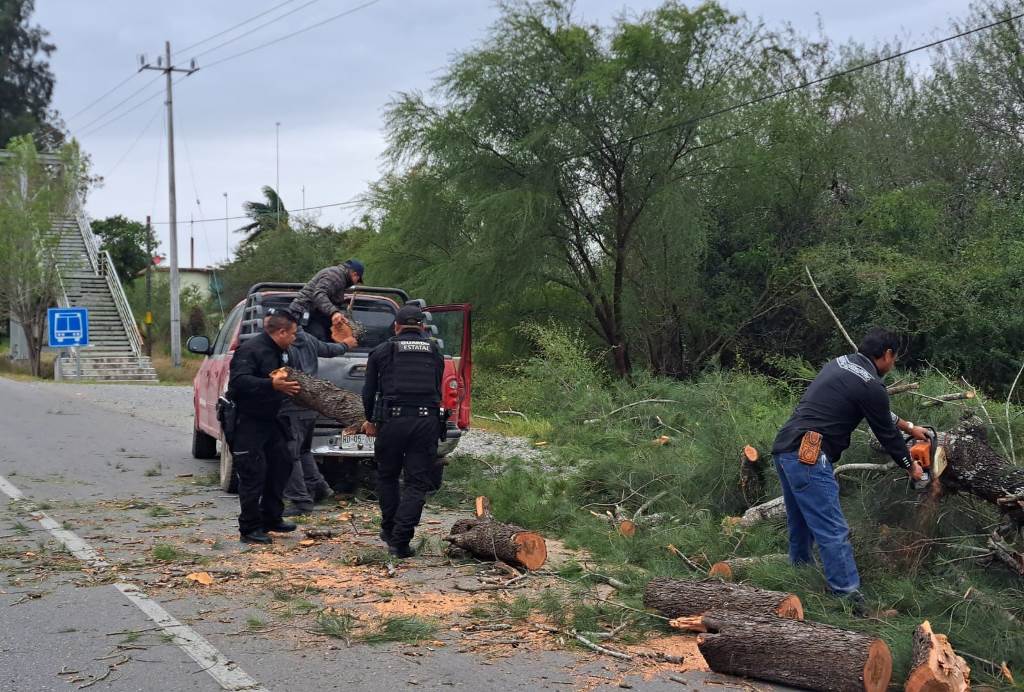 Güémez, Tamaulipas.- Al implementar el Operativo Invierno Seguro Héroes Paisanos 2025 personal de la Guardia Estatal en el municipio de Güémez, retiró un árbol que obstruía la vialidad en la Carretera Federal 85 Victoria-Monterrey.