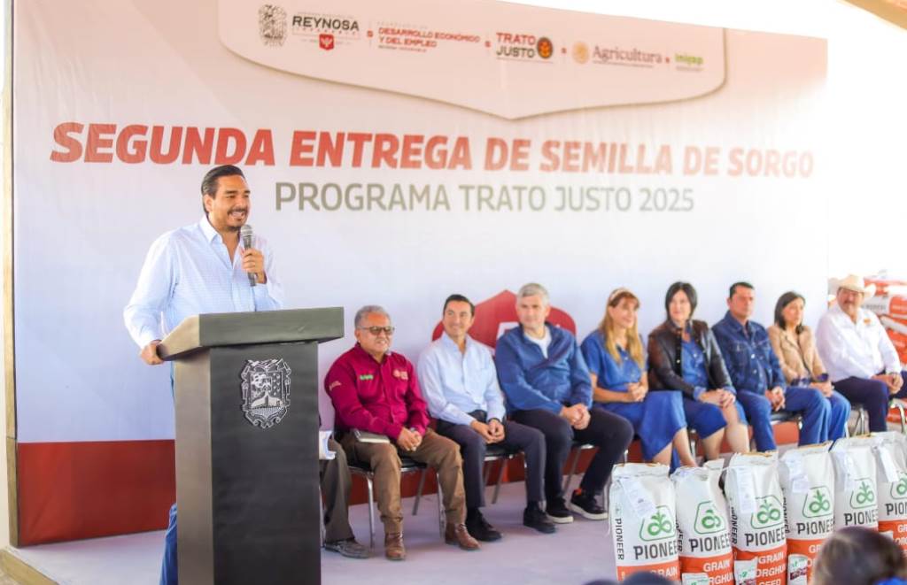 Reynosa, Tam.- «Me uno a las palabras de agradecimiento y reconocimiento hacia Carlos Víctor Peña Ortiz, Alcalde de Reynosa, por el programa Trato Justo, que ha sido un verdadero apoyo para las familias campesinas», dijo con emoción ante familias del campo, el señor Eleodoro Quintero Ballesteros, en presencia de la Senadora Maki Esther Ortiz Domínguez y los Diputados Casandra Priscila De los Santos Flores, Claudia Alejandra Hernández Sáenz y Juan Carlos Zertuche Romero.