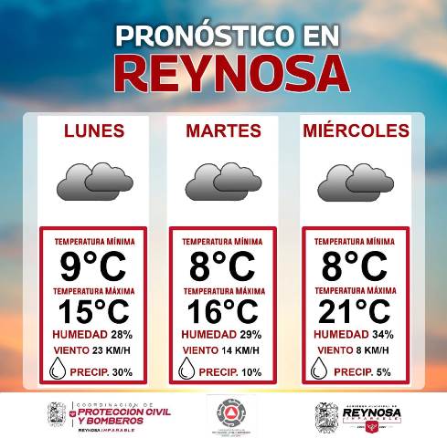 Reynosa, Tam.- La Coordinación de Protección Civil y Bomberos del Gobierno de Reynosa, informa que de acuerdo al Servicio Meteorológico Nacional, este martes 30 de diciembre se registrará un leve descenso en la temperatura ambiente, con la probabilidad de bajar a 8° Centígrados, con máxima de 16°.
