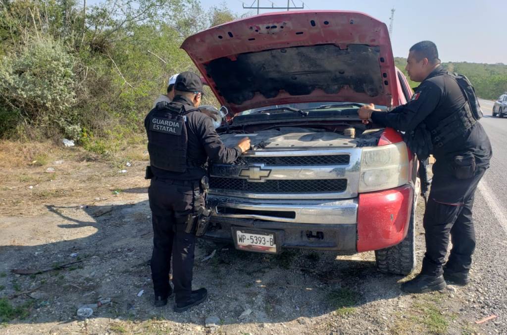 Jiménez, Tamaulipas.- Personal de la Guardia Estatal brindó apoyo a un automovilista que presentó una falla mecánica mientras circulaba por la Carretera Federal 101, tramo Victoria–Matamoros, como parte de los recorridos de seguridad y vigilancia.