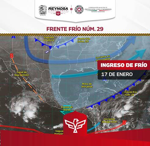 Reynosa, Tam.- El Gobierno Municipal de Reynosa informa que como efecto del Frente Frío Número 29, este sábado 17 de enero se podría registrar el descenso de la temperatura hasta entre 6° y 7° Centígrados, considerando que la máxima se situaría en 18°, con alta probabilidad de lluvia, de acuerdo a datos del Servicio Meteorológico Nacional.