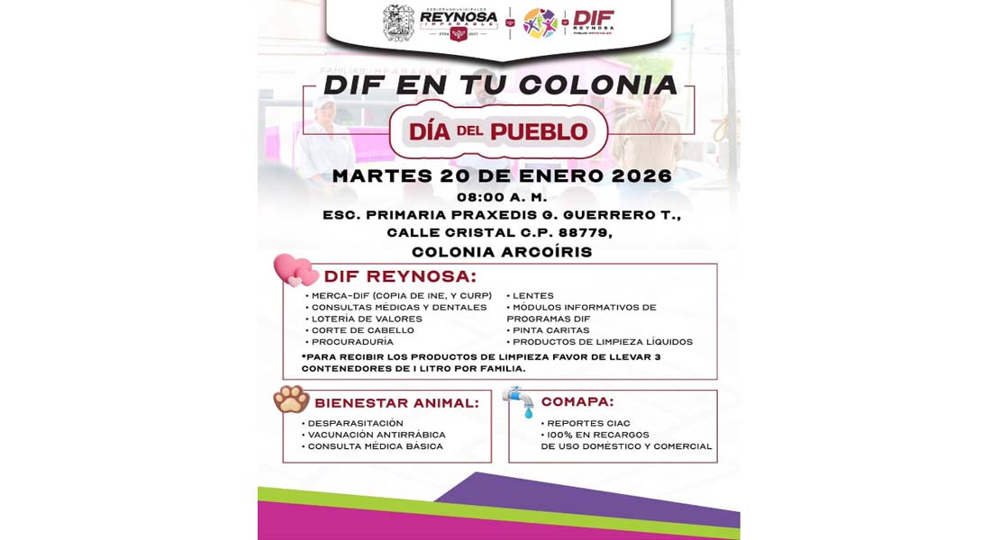 Este martes 20 de enero, desde las 08:00 horas ⏰ 📍 Escuela Primaria “Práxedis G. Guerrero T.” Servicios gratuitos de salud, Merca-DIF y atención para mascotas 🩺🐾 Navegación de entradas Indica pronóstico regional temperatura fresca para la semanaProtección Civil y Bomberos Reynosa