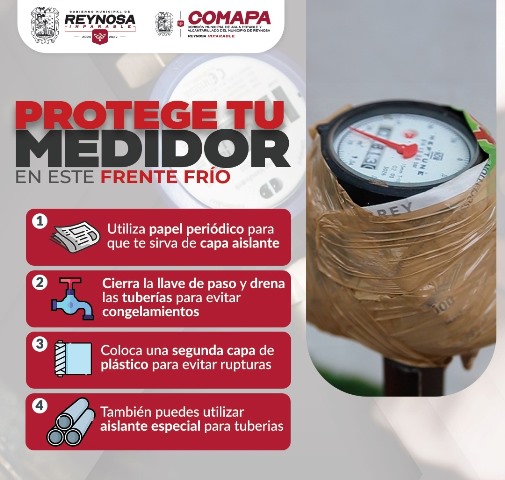 Reynosa, Tam.- La Comisión Municipal de Agua Potable y Alcantarillado de Reynosa hace un llamado a la ciudadanía a tomar medidas preventivas para proteger los medidores de agua ante la posible llegada del frente frío No. 30, que podría provocar bajas temperaturas en la región.