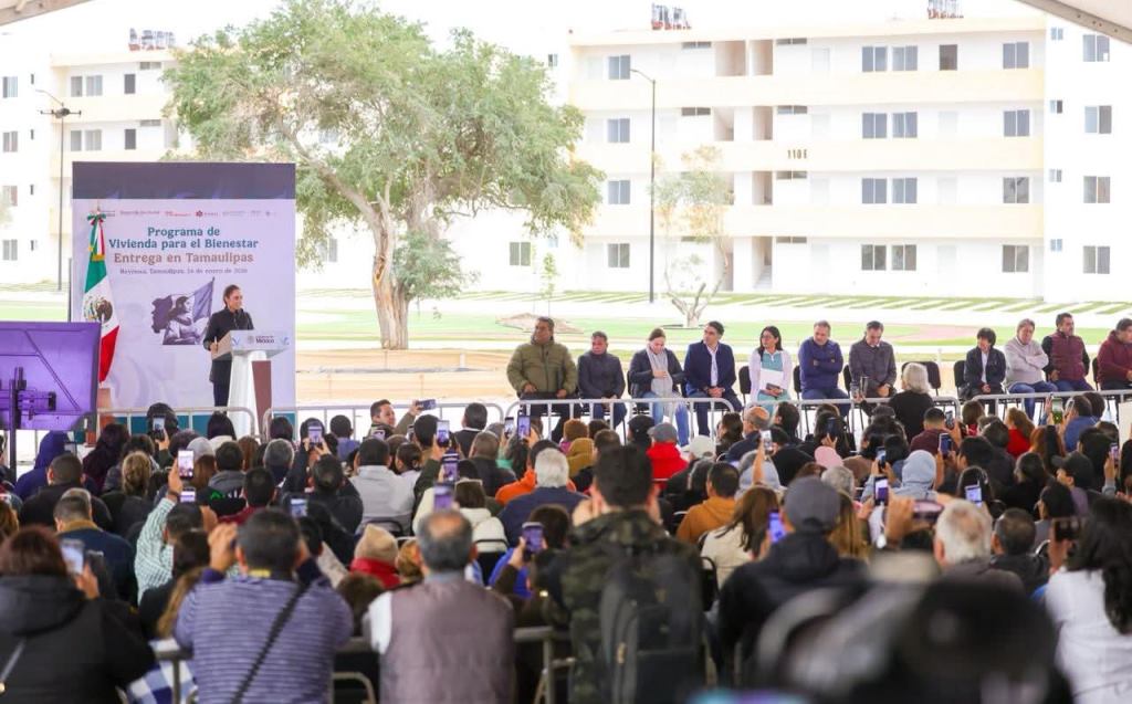 Reynosa, Tam.- «Me da mucho gusto estar hoy aquí en Reynosa, Tamaulipas, para entregar beneficios de los programas del Gobierno de la República. Agradezco la presencia del Gobernador Constitucional de Tamaulipas, Doctor Américo Villarreal Anaya, y del Presidente Municipal de Reynosa, Carlos Peña Ortiz», dijo la Presidenta al encabezar la entrega de beneficios de programas federales, de Vivienda del Bienestar y Pensión para Mujeres Bienestar.