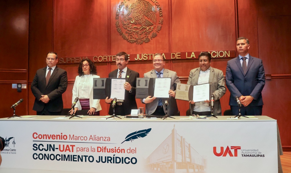 Ciudad de México.- La Universidad Autónoma de Tamaulipas (UAT) y la Suprema Corte de Justicia de la Nación (SCJN) suscribieron el Convenio Marco Alianza SCJN–UAT para la Difusión del Conocimiento Jurídico, así como un convenio específico en materia de servicio social.