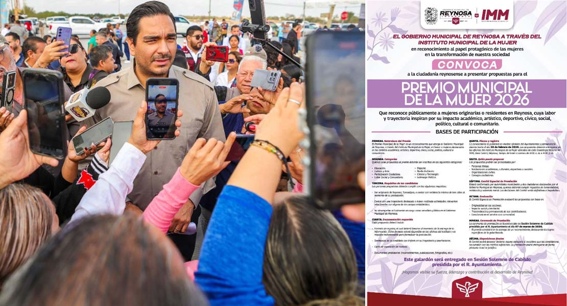 Reynosa, Tam.- El Alcalde Carlos Peña Ortiz invita a participar en la Convocatoria del Premio Municipal de la Mujer 2026, que reconoce públicamente a mujeres originarias o residentes en Reynosa, cuya labor y trayectoria inspiran por su impacto académico, artístico, deportivo, cívico, social, político cultural o comunitario.