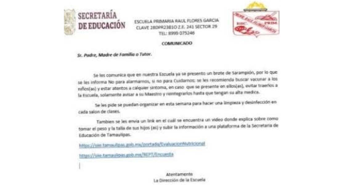 Reynosa, Tamaulipas.- La Escuela Primaria “Raúl Flores García”, ubicada en la colonia Loma Real de Jarachina Sur, emitió un comunicado interno en el que advierte sobre un posible brote de sarampión dentro del plantel.